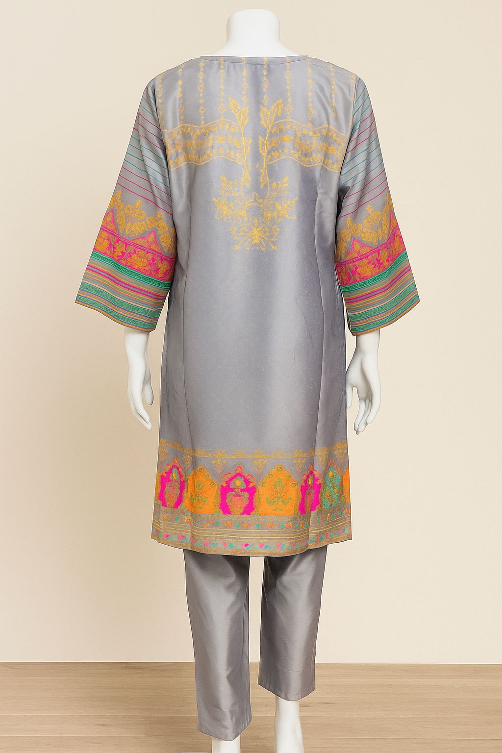 A chic grey two-piece set featuring a straight-cut shirt adorned with vibrant ethnic motifs in yellow, pink, and green. The intricately detailed sleeves with multicolor stripes add a touch of modern charm, while the matching trousers complete the look. Perfect for casual gatherings or semi-formal occasions, this outfit blends tradition with contemporary elegance.